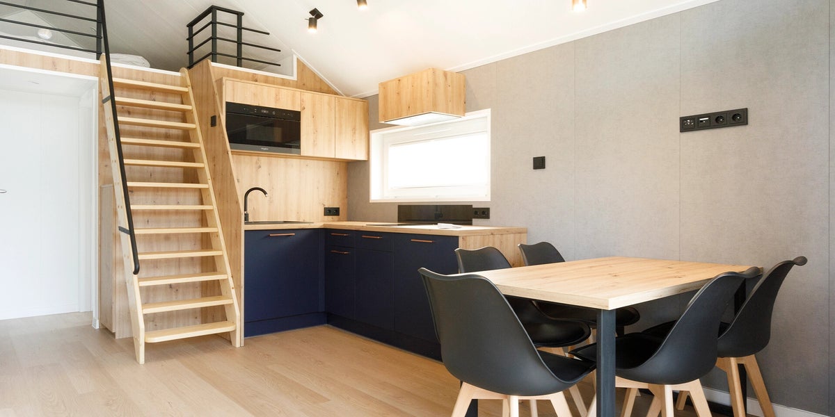 Zodra je binnenstapt, word je verwelkomd door een overvloed aan natuurlijk licht dat door de grote ramen naar binnen stroomt. De ruime woonkamer vormt het hart van deze woning, met een gezellige, volledig uitgeruste kitchenette die naadloos integreert in het ontwerp. Een elegante trap leidt naar de optionele mezzanine - een veelzijdige ruimte die je kan transformeren tot een extra slaapkamer, een inspirerende thuiswerkplek of een knusse ontspanningshoek.